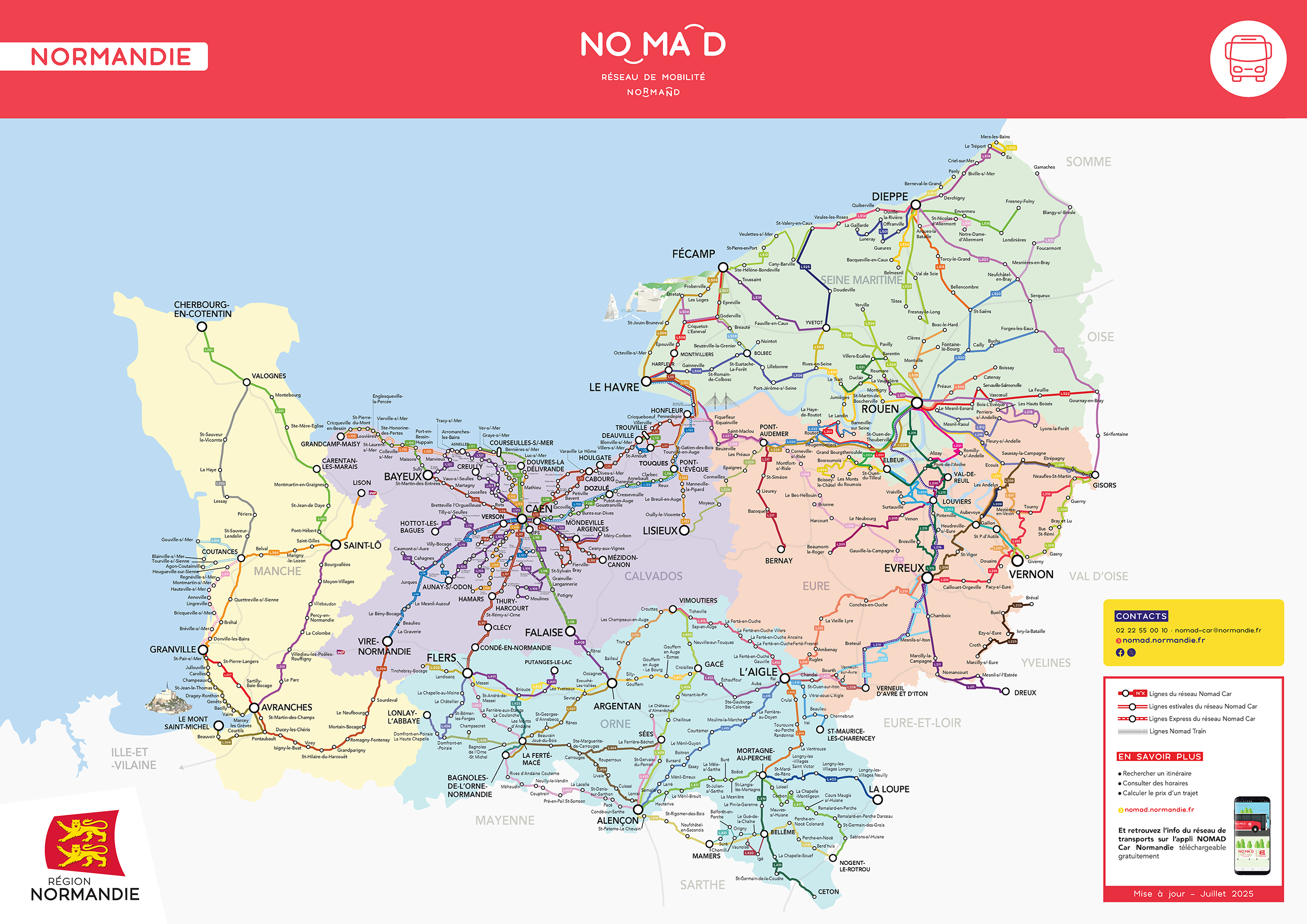 NOMAD, le réseau de mobilité normand, regroupe cars, trains, transports à la demande et covoiturage dans toute la région Normandie.
